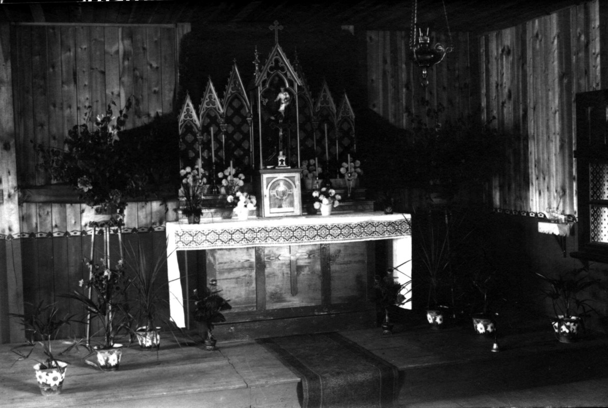 In den letzten Tagen vor Weihnachten 1919 wurden die sich in der Schule befindlichen Sachen in die Baracke gebracht. Für die Beleuchtung wurden 2 Flur-Petroleumlampen angeschafft, die an den beiden Pfosten, die Decke und Dach trugen, angebracht wurden. Ein großer alter Kanonenofen, der aus feuerpolizeilichen Gründen mit einer eisernen Schutzwehr umgeben war, sorgte für die Erwärmung der Kirche. Rechts vom Ofen hing an einem Pfosten ein von Frau Timm gestiftetes altes Kruzifix.